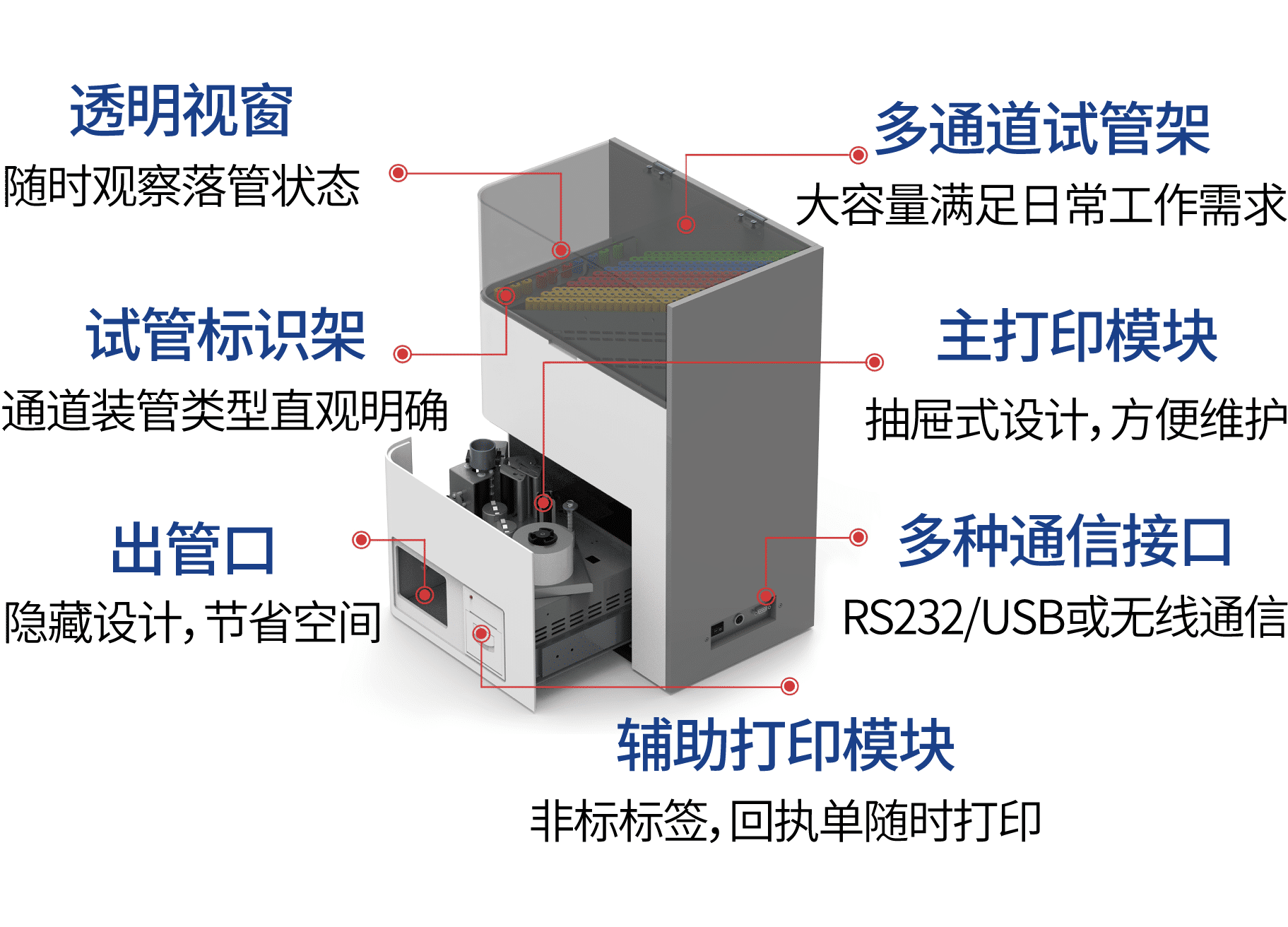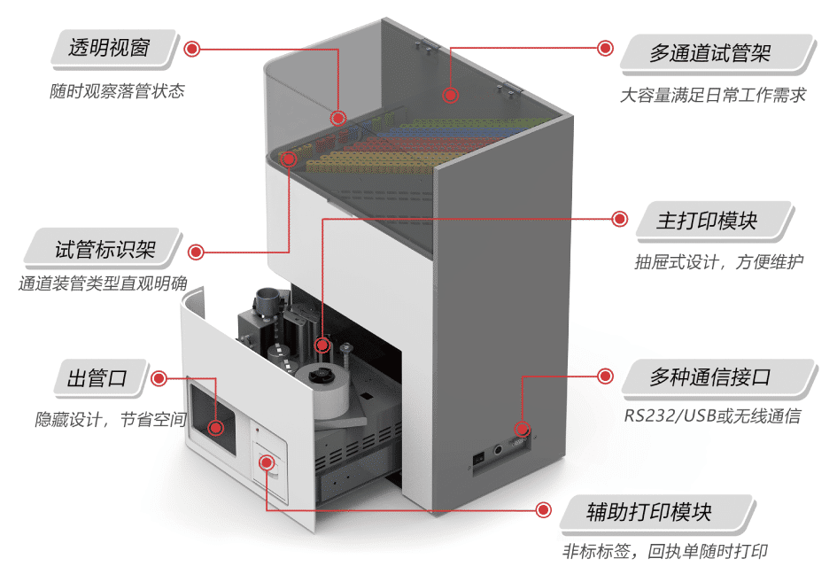 智能采血管自動貼標機集智能選管、自動打印、自動貼標功能于一體,替代了傳統采血過程中人工選管粘貼標簽環節,優化了采血流程,為患者提供了高效率、零差錯的診療服務。